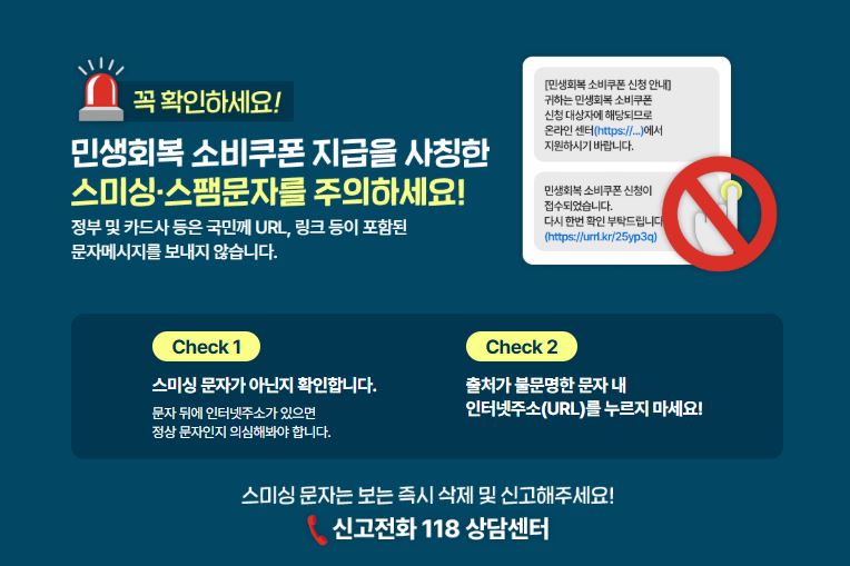 민생회복 소비쿠폰 지급에 대해 정부나 카드사는 문자메시지를 보내지 않습니다. 만일 그와 같은 문자메시지를 받으면 절대 인터넷주소(URL)을 눌러서는 안됩니다. 받은 즉시 삭제해야 합니다.